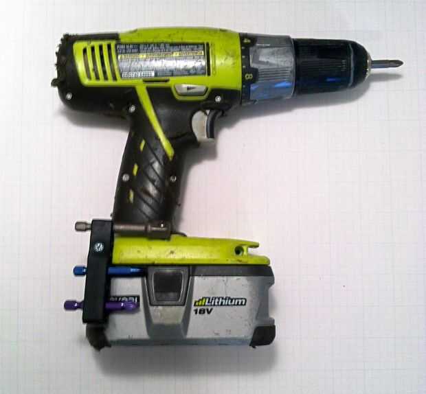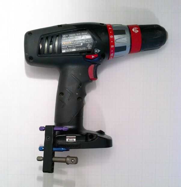En la base de virtualmente cada taladro, hay puertos de tornillo que sujetan las dos conchas de plástico. Puede quitar el tornillo en uno de esos puertos y reemplazarlo por un tornillo más largo. Por ejemplo, mi artesano y Ryobi perforadoras veterano utilizan un tornillo de metal cabeza #6. Mi conjetura es que muchos veteranos modelos utilizan el mismo.