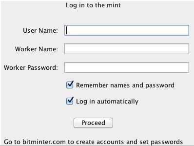 Configurar el software mediante la vinculación a su trabajador que creó en el paso 7. "Haga clic en configuración" > "Cuentas...". Al lado de "nombre de usuario:" el nombre de usuario que creaste al crear la cuenta de BitMinter. Al lado de "nombre del trabajador:" y "trabajador contraseña:" ingrese el nombre del trabajador y trabajadora contraseña que creó en el paso 6.