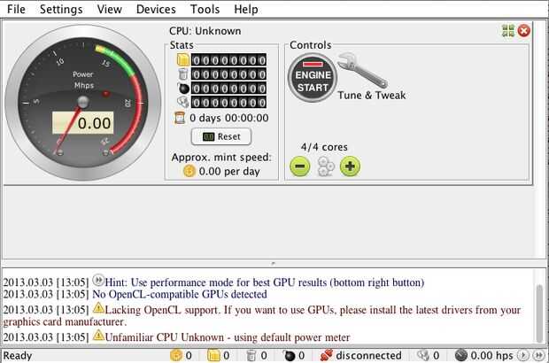 Si la ventana es pequeña, haga clic en el botón en la esquina inferior derecha de la pantalla. Haga clic en el botón "Inicio de motor" al lado de cada uno de los dispositivos que desea utilizar. Para la referencia, me sale sobre 65 IASC (millones hashes por segundo). Khps 1000 = 1 IASC. Todos los dispositivos de prueba, pero usted debe realmente sólo molesta corriente los dispositivos que 25 IASC o superior.