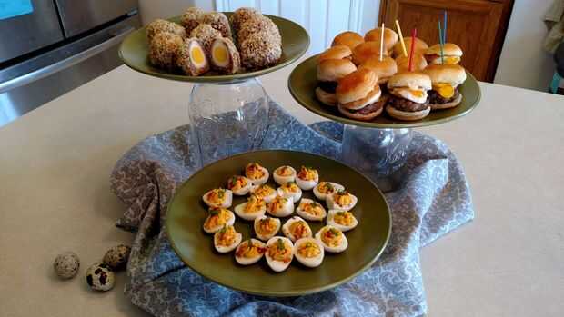 Aquí están tres bites brunch pequeña usted puede hacer fácilmente de huevos de codorniz: deviled huevos, huevos de scotch y roscos de huevo salchicha.