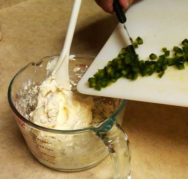 Ahora es el momento de combinar el queso crema y jalapeños en cuadritos. Usando un cuchillo, raspar el jalapeño en cubos de su tabla de cortar en la taza o tazón para mezclar.