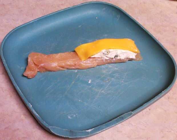 Una vez la mezcla crema de queso y Chile Jalapeño se ha extendido en un extremo de la tira de pechuga de pollo, puede añadir una tira de queso sobre la mezcla. Elegí hacerlo así sólo para mayor sabor a mis bocados de pollo jalapeño envueltos en tocino. Puede utilizar cualquier sabor de queso, y queso rallado también es suficiente.