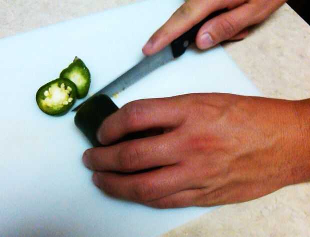 Utilizando la tabla de cortar y el cuchillo, corte el chile jalapeño. Para ello, sosteniendo un extremo de la luneta de Chile Jalapeño con una mano y cortándole el tallo del chile jalapeño con la otra. Luego, corte el chile jalapeño del centro para revelar el interior.