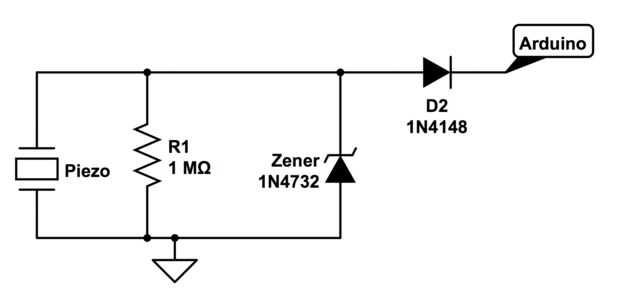 Para la detección de caricias, utilizamos un circuito de sensor eléctrico piezoeléctrico simple. Un elemento piezoeléctrico produce una tensión cuando se aplica presión a ella. Este voltaje entonces se regula con un Diodo zener que evita que el voltaje supere un cierto valor (3.3 V en nuestro caso). Este voltaje es enviado entonces a la clavija de entrada analógica en el Arduino a través de un diodo rectificador. El diodo rectificador evita que voltajes negativos va a Arduino. Este es un circuito de detección bastante crudo y tendrá que ser mejorado, pero es funcional.