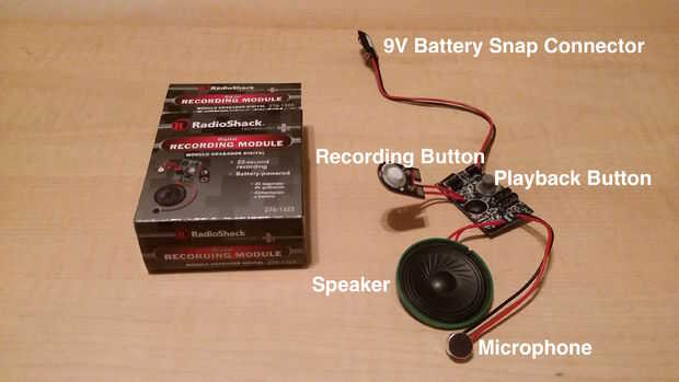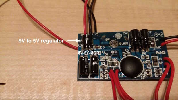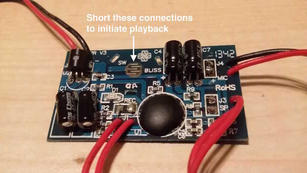 Para el circuito de la corteza, he utilizado un Módulo de grabación Digital que compré de RadioShack hace unos años. El módulo le permite grabar un sonido (hasta 20 segundos) y reproduce el sonido al pulsar un botón. La memoria es no volátil (que significa que el sonido no Haz borrado cuando el módulo pierde energía). Simplemente encuentra un ladrido de perro suena fresco y había grabado el sonido. Hice un poco de modificaciones de arranque algunas de las conexiones del módulo de grabación. He quitado el botón de reproducción y soldar un cable a las conexiones en su lugar. De esta manera podía controlar la reproducción utilizando mi propio circuito. Para el módulo de grabación, el botón cortos un resistor de pull-up a la tierra. Simplemente encontré la resistencia el botón estaba conectado y conectado la resistencia a un MOSFET tipo n por lo que pude controlar la reproducción utilizando un Arduino. Como usted probablemente ha notado, el módulo de la grabación tiene un conector de complemento de la batería de 9V. La fuente de batería de 9V alimenta un regulador de 5V que alimenta el módulo. Pasa por alto el regulador por soldar un cable a su salida y conectarlo a la salida del regulador de 5V que ya está en poco. Así que no necesitaba una batería adicional para el módulo ya que poco puede proporcionar una fuente de energía.