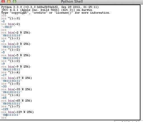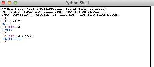 Por ejemplo: si llevamos a cabo el en el siguiente ejemplo: >>> ~ (1 << 0), en Python tenemos -2, si después utilizamos >>> bin(-2), obtenemos '-0b10'. Para corregir el problema y mostrar un tipo completo de 8 bits en el siguiente: