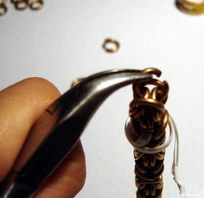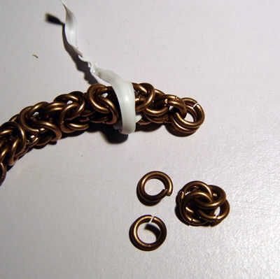 Tomar un anillo abierto en segundo lugar y deslice en su lugar paralelo al primer anillo abierto (pero ahora cerrado). Asegúrese de que pasa por exactamente los mismos anillos que atravesó el primer anillo abierto, pero que el primer anillo abierto no cruza el nuevo anillo abierto.