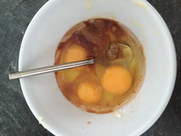 a continuación, mezcle 3 huevos con el extracto de almendra, vainilla y chocolate.