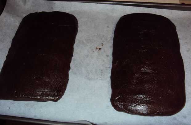 Una vez que la masa se combina bien, formar la masa en dos rectángulos largo. Asegúrese de que la masa es mounded más en el medio para conseguir la forma de estándar biscotti.