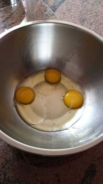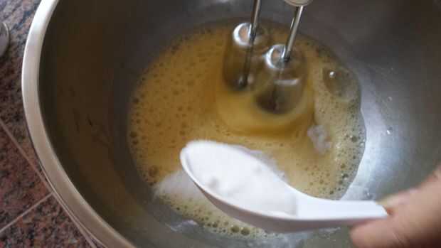 Crack los 3 huevos en un solo recipiente y batir con el batidor de huevo. Poco a poco agregue 1 taza de azúcar y batir hasta que el azúcar se haya disuelto completamente (unos 15 minutos). Añadir la cucharadita de levadura en polvo también.