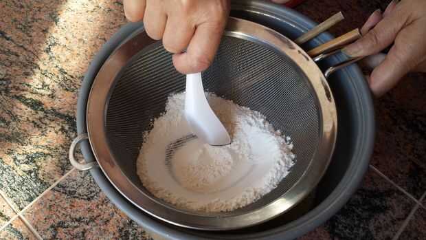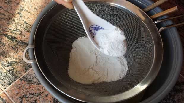 A continuación, tire de su harina y tamiz. Cernir lentamente en las 2 tazas de harina (mezcla entre es fino pero no es necesario) y añadir más o menos dependiendo de la consistencia. 2 tazas de harina generalmente funciona, pero para ser precisos, usted necesita solamente agregar suficiente harina para lograr la consistencia deseada y del color en la última foto.