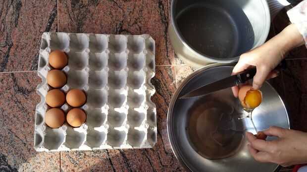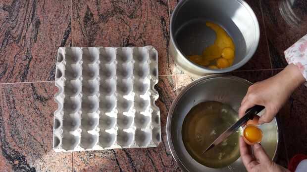 Para la versión al horno, comenzar sacando los 7 huevos y separar las claras de huevo y las yemas de huevo cuando se rompen.