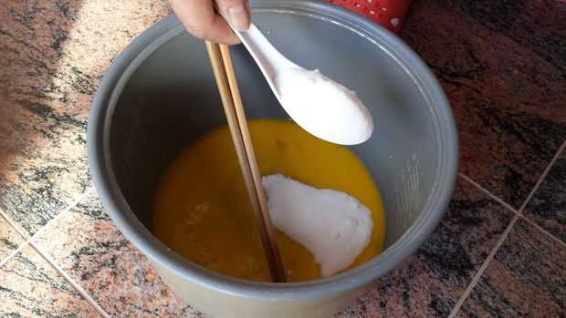 Luego en el recipiente con las yemas, use un utensilio (los palillos son siempre mis armas de elección, pero depende de ustedes) les azote un poco a la mezcla antes de agregar gradualmente 3/4 tazas de azúcar (excepto el restante 1/2 taza para más adelante). Puede elegir no ir a loco con el azúcar, dependiendo de sus preferencias. NO añadir todo el azúcar a la vez a menos que quieras pasar décadas de mezcla; haciendo la incorporación poco a poco se acelera el proceso que permite que el azúcar se disuelva.