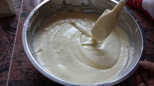 Una vez completa (finalmente... sí, eso lleva un tiempo), coge la taza de las adiciones de yema de huevo y agregar a las claras de huevo batidas. Doblar suavemente las mezclas dentro de otra para que forma un agradable color Narciso pálido.