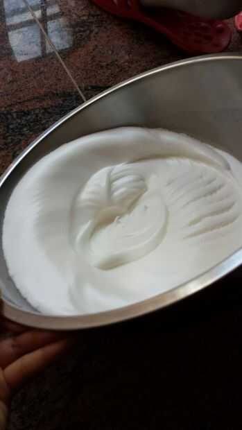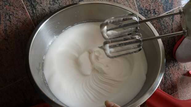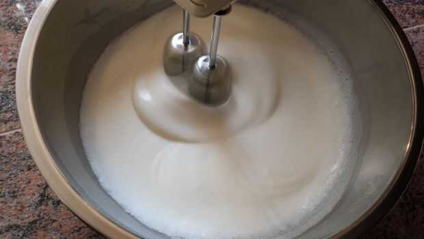 En el recipiente con las claras de huevo, batir las claras añadiendo poco a poco en el restante 1/2 taza de azúcar. (como se puede ver, el tema general de finura es bueno tener...). Usted tendrá que batir las claras de huevo y azúcar por unos 15 minutos, o hasta que la mezcla resultante es de un blanco lechoso agradable que no se deslice cuando usted incline el recipiente. Si tira el batidor de huevo hacia fuera, picos de la mezcla debe forma pero debe ser lo suficientemente fuertes como para que no hunda.