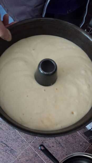 Vierta toda la mezcla en una bandeja para hornear engrasada de su elección (alguna forma de bundt pan funciona mejor) antes de empujar en el horno precalentado.