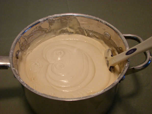 Seguir añadiendo harina cernida 1 taza a la vez mientras se mezcla bien en el medio hasta los 3 1/2 tazas.