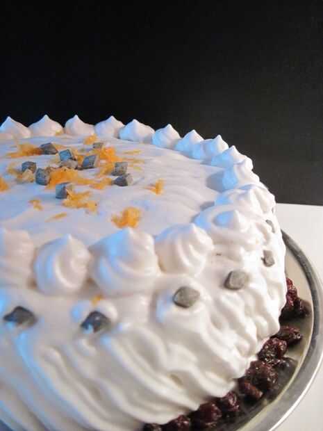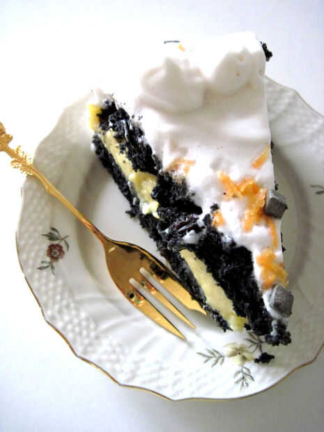 Inocentemente nubes blancas de merengue capa este místico pastel negro con relleno amarillo. El sabor es igualmente místico y dulce - regaliz con relleno de naranja! Sin embargo, se trata de regaliz como en la raíz de regaliz, que difiere un poco de caramelo de regaliz, aunque está relacionado con. Así que los de ustedes que piensan ugh, regaliz! --reto a que pruebe esto! Es dulce con un sabor profundo, complementado con limón y naranja fresca.