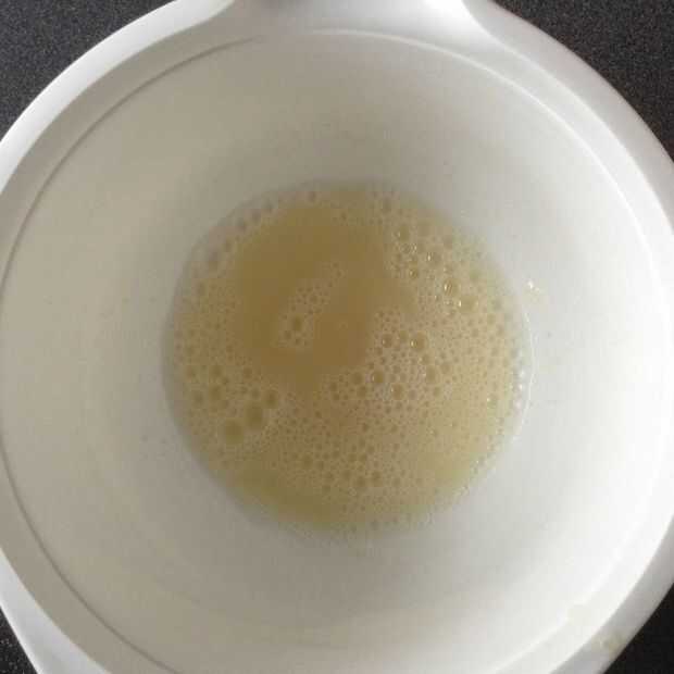 Aquí es cómo hacer el merengue francés que utiliza. Látigo de 1 dl. el agua de los garbanzos enlatados y el juiceuntil de limón tiene picos suaves. (Imagen 1 y 2)