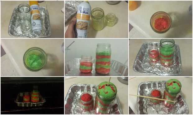 Añadir 2 cucharadas de la masa roja en la parte inferior de todos los frascos y empezar a acodar el vaso en colores de la masa alternativa, hasta llegar a 6 capas.