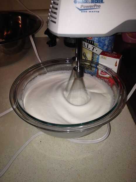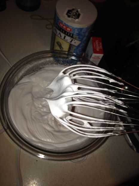Usar la batidora eléctrica batir las claras de huevo. Esto permitirá que el aire que se mezclará en la clara del huevo, haciendo la mezcla expandir y hacer crecer en volumen. Una vez que comienza a hacer espuma, agregar 1/4 cucharadita de Crémor Tártaro. Esto ayudará a la forma de picos. Como la mezcla se espese, agregue lentamente el azúcar 1/2 taza en incrementos de 4, alrededor de 1/8 taza a la vez. Continuar mezclando las claras de huevo hasta que formen picos (esto debe tomar menos de 8 minutos en el ajuste de la velocidad de la batidora de mano). Los picos deben permanecer incluso después de que el mezclador es sacado de la espuma de clara de huevo (como se muestra en la imagen).