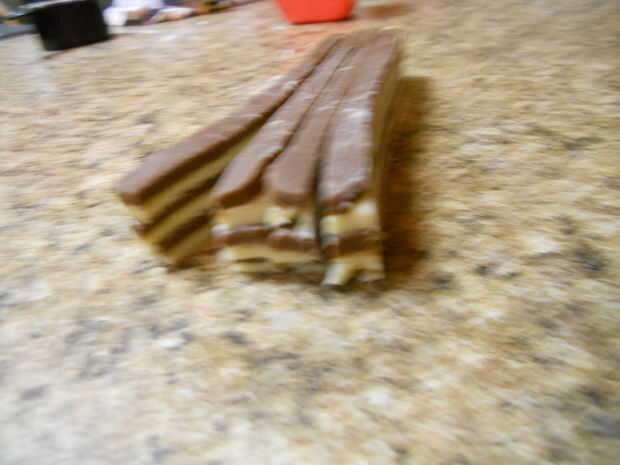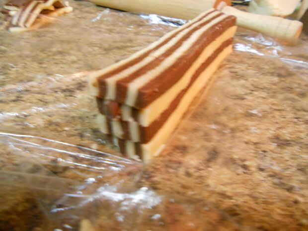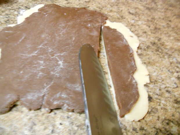 Para hacer el tablero corrector, solo extienda el partes iguales de la masa de chocolate y vainilla. Cepillo algún lavado de huevo en una capa de masa y poner el otro trozo de masa en la parte superior. Luego cortar los bordes de la masa para hacer un rectángulo bonito. Después de eso, es sólo una cuestión de cortar el rectángulo en tiras y apilado las tiras encima de la otra (con un slathering de claras de huevo entre cada capa para ayudarles a permanecer juntos). Corte la manzana en tiras otra vez y gire las rayas... entonces, usted obtendrá un tablero de ajedrez!