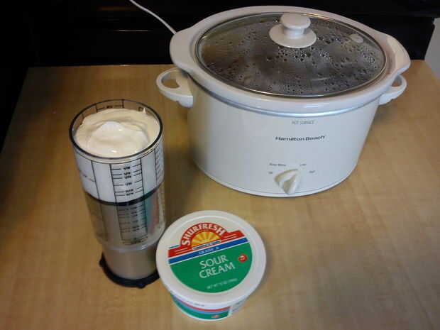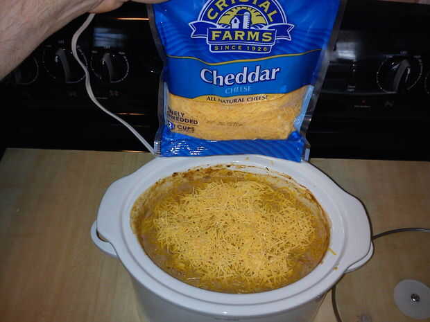 Después de la marca de 6 horas, puede triturar el pollo si usted no cortarlo antes como hice yo, o si prefieres pollo desmenuzado. Luego añades el 1 taza de crema agria y mezcla - también he añadido un poco de queso cheddar a la parte superior. No sé si el queso era realmente necesario, como lo todavía ponemos después, sacando hacia fuera realmente no funcionaba.