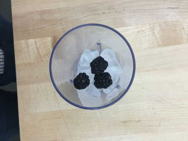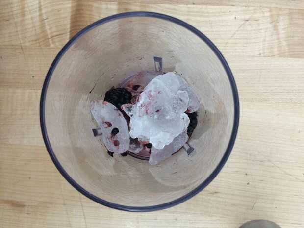 Poner el hielo y la Mora (3-4 frutos por vaso) en una taza. ¡ Agarra tu trituradora y puré! Mandriles (Chucks) es aceptables, solo machacar las bayas un par de veces.