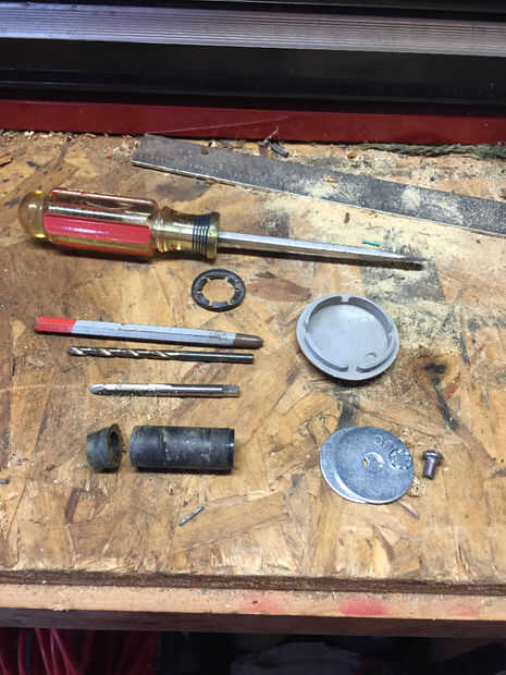 Con la sección del buje rota, el anillo de retención ya no tiene la rueda, así que mi idea es taladro y aprovechar un agujero en el extremo del eje y utilice un tornillo y arandelas para sujetar la rueda. Las siguientes secciones asumen que ya estás familiarizado con el uso de todas las herramientas enumeradas.