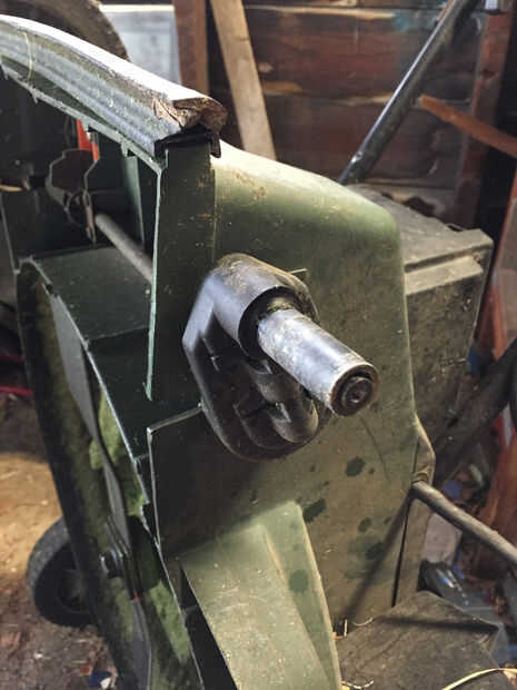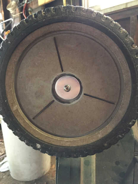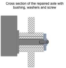 Ahora que el buje está cortado a la medida, se puede colocar sobre el eje. A continuación, deslice la rueda sobre el buje y eje y use dos de #10 arandelas (eran un poco finos para utilizar sólo uno), el #10 interior estrellas arandela de cierre y 3/8" 10-32 NF tornillo para fijar la rueda a la podadora. El dibujo muestra el arreglo básico de las partes en una sección transversal.