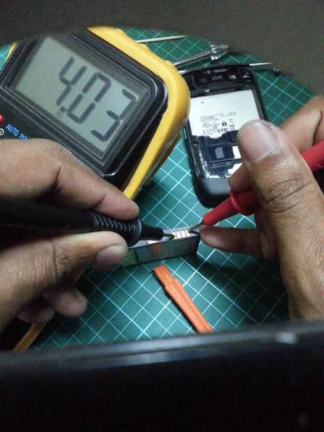 Desde entonces se ve como un problema de carga, es bastante obvio para probar la batería primero. Mi multímetro Lea 4.03V que significa que está casi completamente cargada. Teléfonos móviles utilizan batería de litio que cuando está completamente cargada leer una tensión de 4.20V.