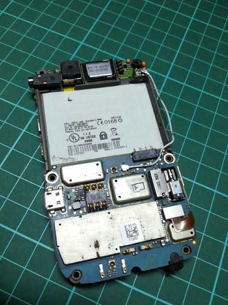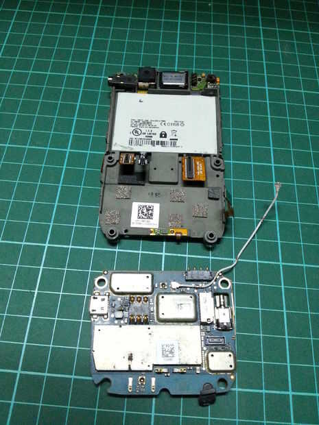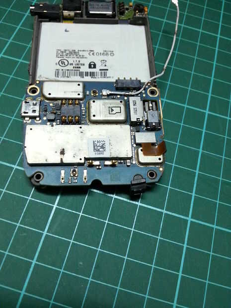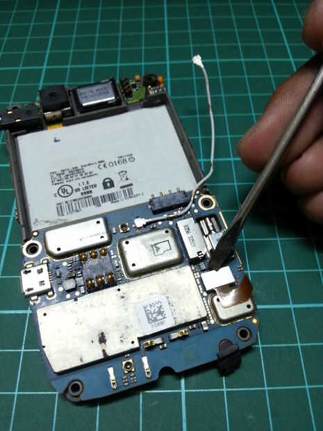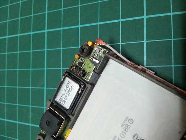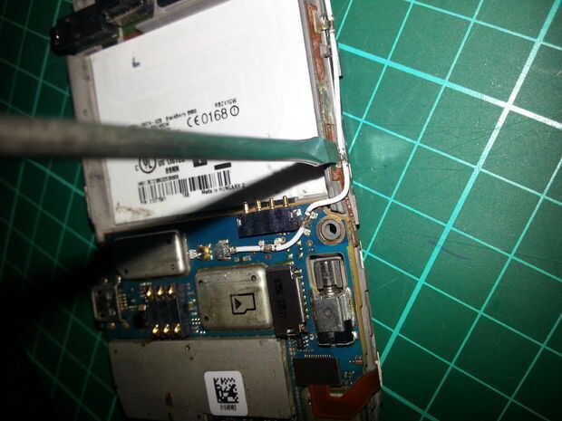 8. hay un blanco cable coaxial de la placa base hasta la antena en la parte superior. Suavemente lo retire en el lado de la antena (no lo desconecte en el lado de la placa base). Debe haber 2 soportes de metal sostiene el alambre junto a la tecla de volumen. Suavemente con el destornillador plano, abra lo suficiente como para sacar el cable.