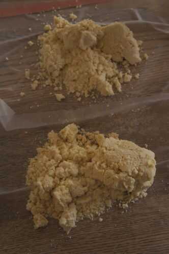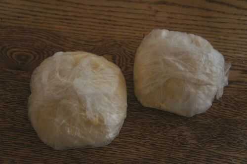 Dividir la masa en dos montones en piezas separadas del abrigo de saran. Utilice la envoltura para formar la masa en discos. Refrigere por al menos una hora.