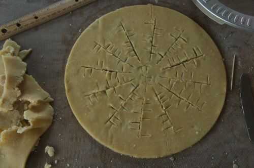 Mientras tanto, estirar su otro disco. Cortar un círculo de 9 1/2". Usé un protector de corteza de pastel (utilizado en la cocción para evitar quemar los bordes) como una guía. Mantener sobre un margen de pulgada del borde, utilice un cuchillo o navaja de afeitar limpia hacer doce cortes hacia, pero no todo el camino a la mitad. Un transportador es útil para esto. Ahora para los 1s y 0s. Aquí están las conversiones de ASCII a binario: