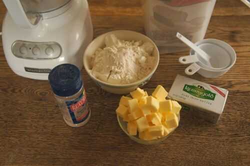 Cortar la mantequilla en sobre cubos de 1/2" y volver al refrigerador o congelador hasta que se necesite. Yo generalmente refrigerar mi ingredientes secos así durante unos 15 minutos antes de comenzar. Una corteza escamosa comienza con ingredientes fríos.