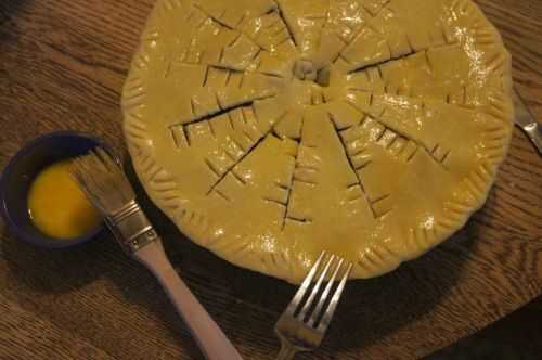 Use una brocha de cocina para cubrir la corteza inferior con clara de huevo. Esto ayudará a evitar que la corteza se empapado. Vierta el relleno en la corteza de la Mora y coloque en la corteza superior, presionando ligeramente los bordes juntos. Mezclar la yema con la crema y el cepillo en la corteza. Utilice un tenedor o una cuchara más firmemente Presione los bordes juntos y dar un borde decorativo. Usé un tenedor, alternando la dirección diagonal para añadir a la apariencia geométrica de la empanada.