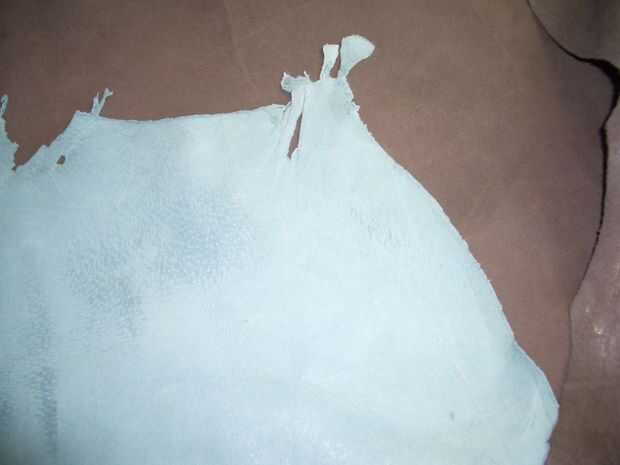 Examinar la piel, sosteniendo a la luz para encontrar los agujeros pequeños o delgados parches.  Tendrá que evitar esas zonas cuando se llega a cortar las piezas.  Si usted tiene un montón de cuero, corte los 4 frentes y espaldas de áreas levemente elásticas de las pieles pero elegir secciones más firmes para las bandas.