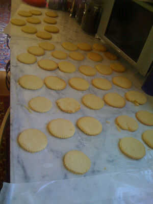 Hornear a 350 grados F por 20 min - no dejes que marrón! Una vez cocido, poner hacia fuera enfriar sobre un mostrador cubierto en papel de cera.