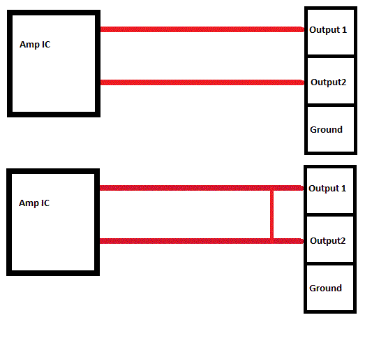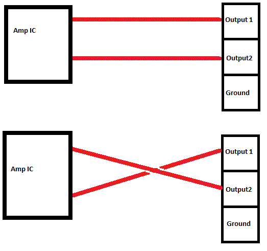 - Si el problema todavía existe y se utiliza un amplificador estéreo IC, una posible solución sería cambiar la izquierda y derecha salidas como en la foto #2. Una solución tal vez más simple sería sólo tiene que conectar ambas salidas porque solo tiene 1 altavoz de todos modos (ver foto #3). Tuve ese problema.