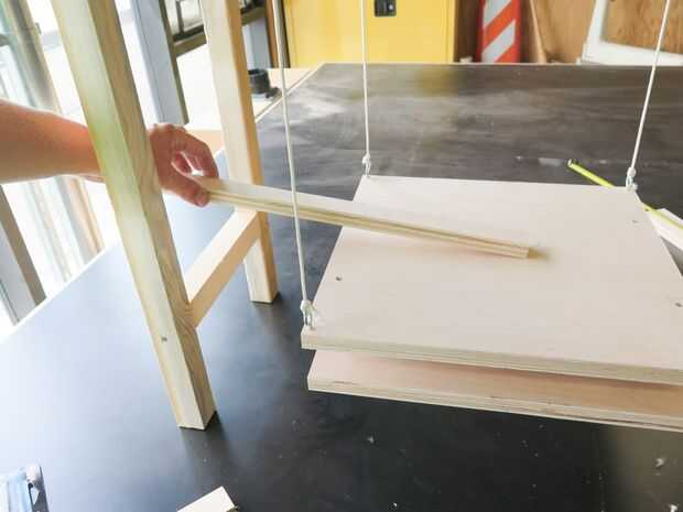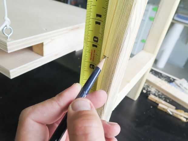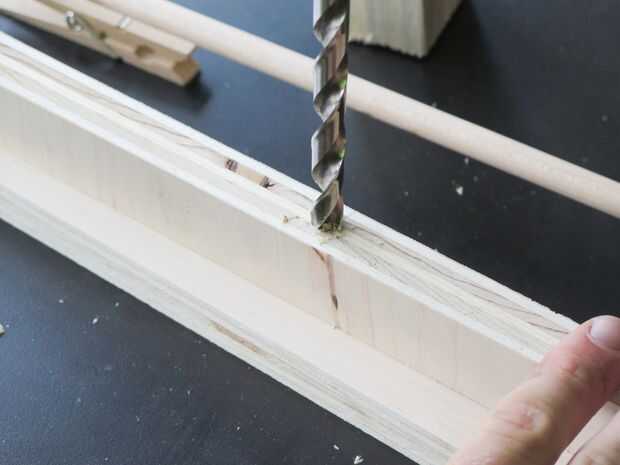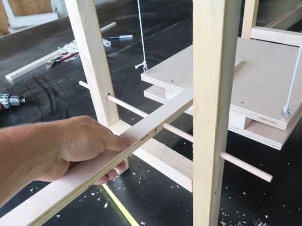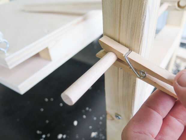 Tiempo a añadir en el componente de dibujo. Agarra un pedazo delgado de madera de desecho que es cerca de 30" de largo. Encontrar un pasador robusto y una broca del mismo diámetro. Perforar la parte de la chatarra y el pasador a través de la alimentación. Seleccione una altura justo por encima de la plataforma (mina era aproximadamente 9,5") y perfore a través de cada pierna en un lado. Introduzca el pasador a través de allí y asegurar en los lados con pinzas para la ropa.