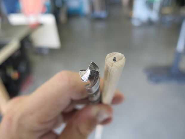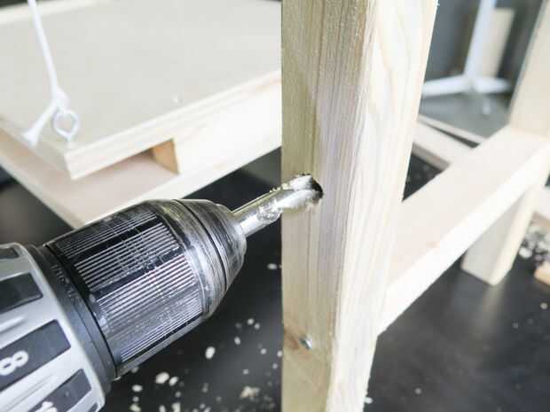 - Asegúrese de que el pasador está suelto en los agujeros de la pata de la mesa así que usted puede levantar arriba y abajo. Desea firmemente a través de la madera.