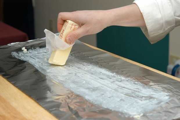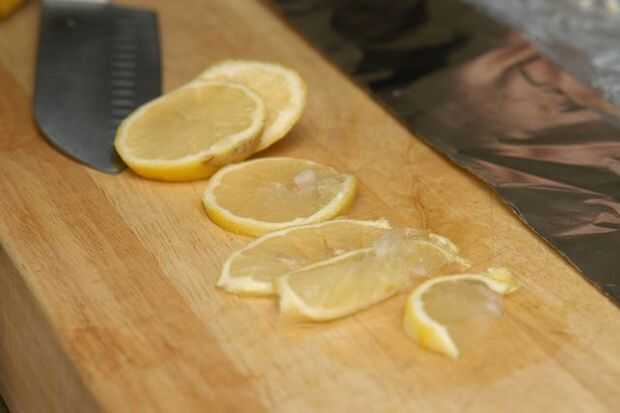 Ahora, utilizando un trozo de papel más de lo suficientemente grande como para gift-wrap completamente su pescado, extender una capa de mantequilla hacia abajo sobre el tamaño de sus peces. Extienda una línea de rodajas de limón.