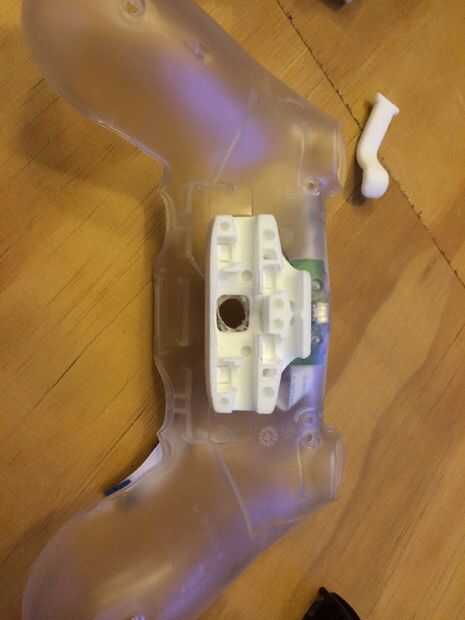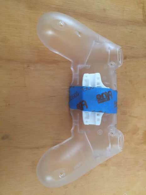 Desmontar el DS4 y perfore un agujero a través del círculo que está en la placa trasera o donde prefieras. 1/4" de diámetro broca agujero es lo suficientemente grande como para caber todos los cables a través por lo que no recomiendo cualquier cosa más grande pero brocas pequeñas deben estar bien. Seco forma parte como se muestra y preparar su epoxi basado en las instrucciones. Con un poco de epoxy (aproximadamente una cucharadita si quieres una estimación general) y una capa generosa en toda la pieza impresa. Coloque la pieza en la parte posterior como se prefiera y fijarlo con cinta adhesiva o bandas de goma. Limpiar cualquier exceso de epoxy y permitir que el tiempo de curado recomendado.
