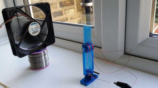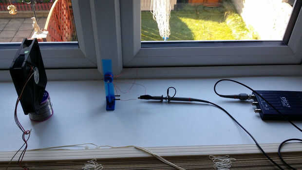Para tomar medidas que conectado ambos extremos libres del alambre de la bobina a una resistencia. Mediante el control de la tensión en la resistencia puedo determinar la corriente generada y por lo tanto la energía generada. Usé una resistencia de 100 ohmios y mide una tensión de +/-10mV a través de las bobinas de una brisa constante creado por mi ventilador de escritorio. Esto implica una corriente de 0.1mA y una potencia generada de 1uW.