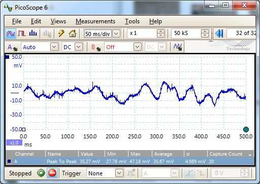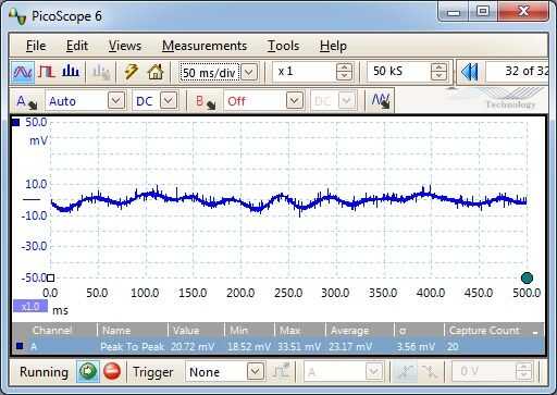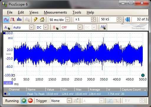 La foto que muestra un montón de ruido pero voltajes más grandes es una prueba con la resistencia de carga de 100 Ohm quitada. Las tensiones son mucho más grandes ahora porque no hay "carga" o flujo de corriente en las bobinas.
