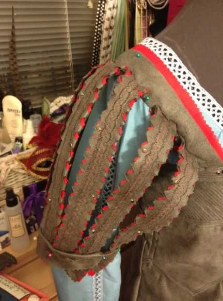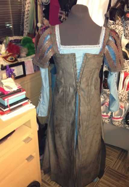 He encontrado fotos en Internet de diseños de traje de Colleen Atwood para la película y mentalmente les deconstruyen. Empecé colgando algunos jersey de algodón en mi dressform para la guarnición underdress. Usé un algodón azul como la tela underdress y había cosida a la guarnición de jersey. He adornado el cuello con algodón azul de encaje de ganchillo y utiliza el mismo encaje azul para las mangas. Había atada a la espalda del vestido con la cinta negra del satén y cordones los manguitos con skane de hilo artesanal azul metálico.