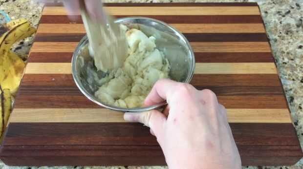 En un pequeño bol, triturar los plátanos usando una cuchara de madera o trituradora de la patata.