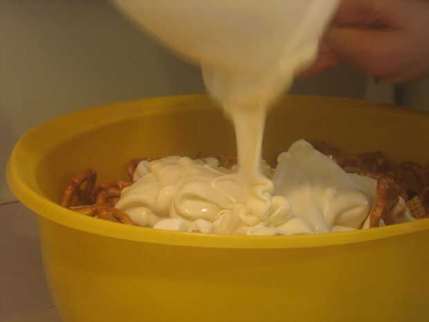 Verter el chocolate sobre la mezcla de cereal y revolver hasta que la cubierta de forma uniforme (no olvide asegurarse de que todos los goodies en la parte inferior Haz cubiertos!).