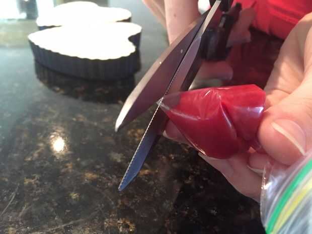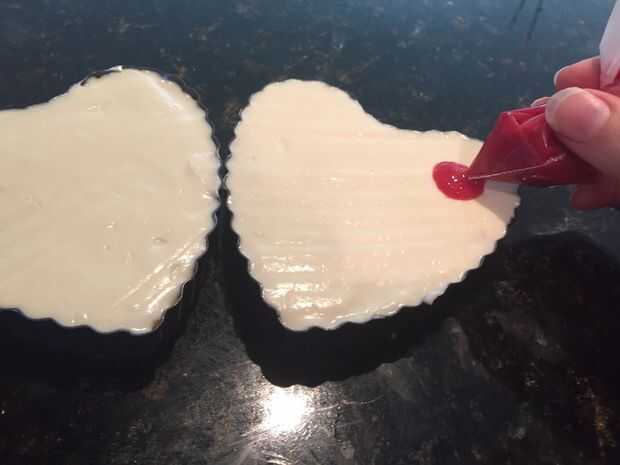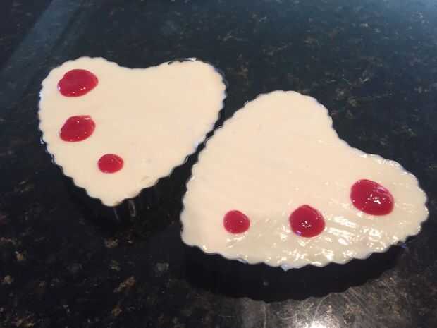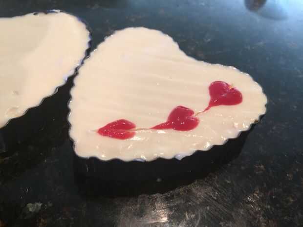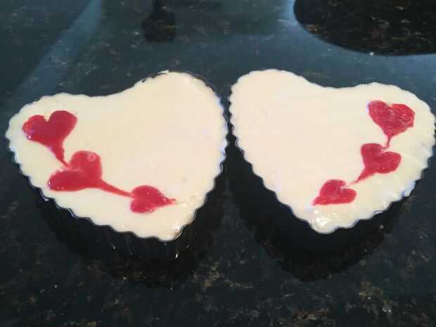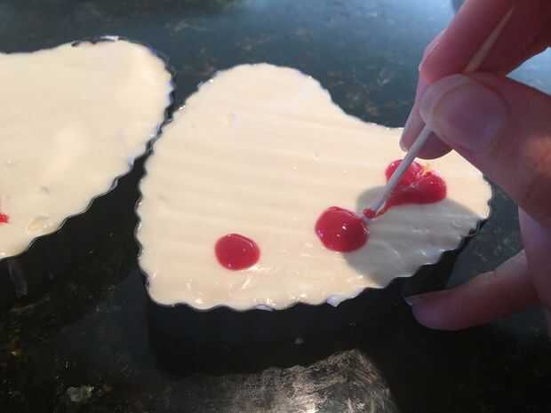 Con el coulis restante colóquela en una bolsa ziplock y cortar la punta para hacer una manga pastelera pequeña. en la parte superior del corazón colocar un círculo grande y luego un círculo más pequeño debajo de él y finalmente un círculo más pequeño hacia la punta del corazón. Luego con un palillo pasar a través de los círculos del más grande al más pequeño (de arriba abajo a punta) que se asemejan a corazones (utilice los palillos para dar nueva forma si es necesario.