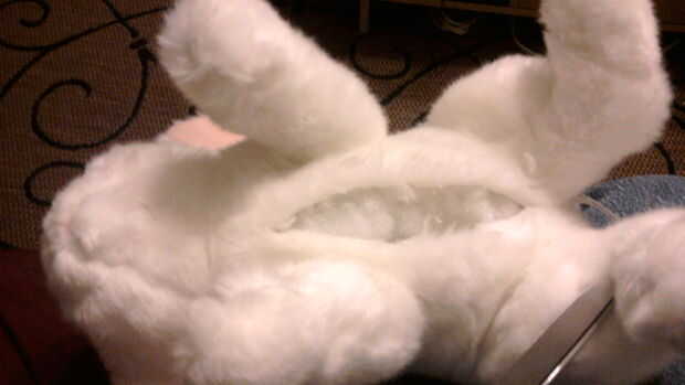 Tanto como me encanta las cosas oscuras y espeluznantes, incluso me costó un poco cortar el conejo toy abierta al inicio. Si el par de tijeras no tiene agujas afiladas puntas, utilizar un punzón o cortantes picahielos para comenzar un agujero piloto para las tijeras para corte de.